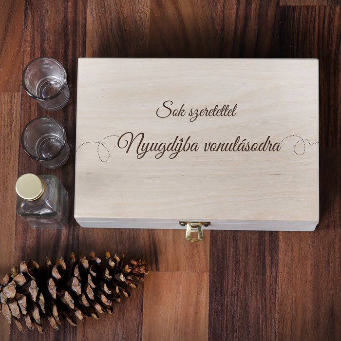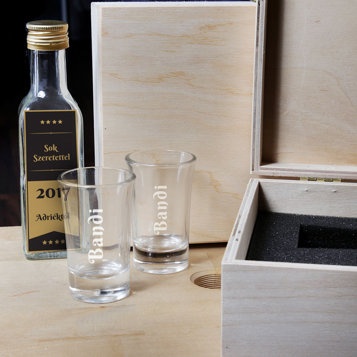 Komplet vsebuje leseno škatlo z gravuro ali potiskom in 2 skodelici (standardne velikosti 4 cm). Izbirate lahko med našimi številnimi obstoječimi grafikami ali pa zahtevate povsem edinstveno grafiko.